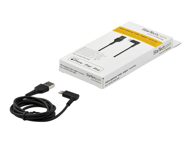 StarTech.com 3ft (1m) Durable USB A to Lightning Cable, Black 90° Right Angled Heavy Duty Rugged Aramid Fiber USB Type A to Lightning Charging/Sync Cord, Apple MFi Certified, iPhone 12 Pro - iPhone 7/8/11/11 Pro - Lightning-kabel - Lightning hann vinklet til USB hann - 1 m - dobbeltisolert - svart RUSBLTMM1MBR