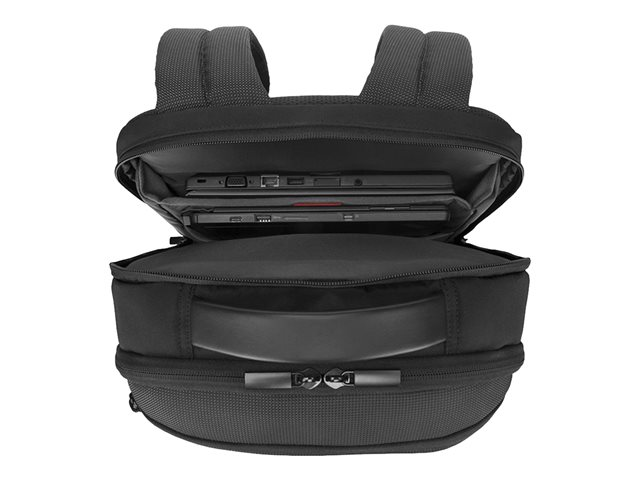 The ThinkPad Professional Backpack is a sleek and modern backpack designed to match the look of Lenovo ThinkPads and made from durable materials and intelligent design. It holds ThinkPads and other laptops up to 15.6" wide. The distinctive "checkpoint-friendly" feature helps you go through airport security faster by not having to remove your laptop from the case. The backpack has padded shoulder straps for comfort as well as a built-in trolley strap. The ThinkPad Professional Backpack's unique "sling" design cradles your ThinkPad laptop for superior protection. Carry a tablet or music player in the smaller storage pouch. It also features a hidden security pocket in the back to hold your passport or wallet, as well as a padded soft-lined compartment for your glasses.